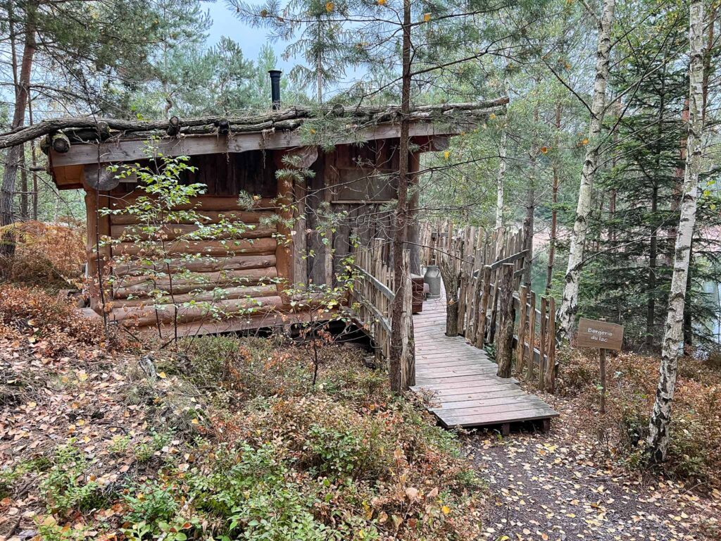 De vijf cabins hebben allemaal hun eigen stijl. Een aantal zijn boomhutten, andere liggen wel weer op de vaste grond. Wij sliepen in Fuste du Trappeur, een cabin geschikt voor vier personen. Een tweepersoonsbed is op de begane grond en op de eerste verdieping staan twee eenpersoonsbedden. Ondanks dat je midden in de natuur zit, is de cabin van alle gemakken voorzien. Met een eigen douche, droogtoilet en klein keukentje kun je je prima redden. Fuste du Trappeur heeft een eigen terras en sauna voor het huisje. Tussen de bladeren van de bomen door heb je uitzicht op het meer.