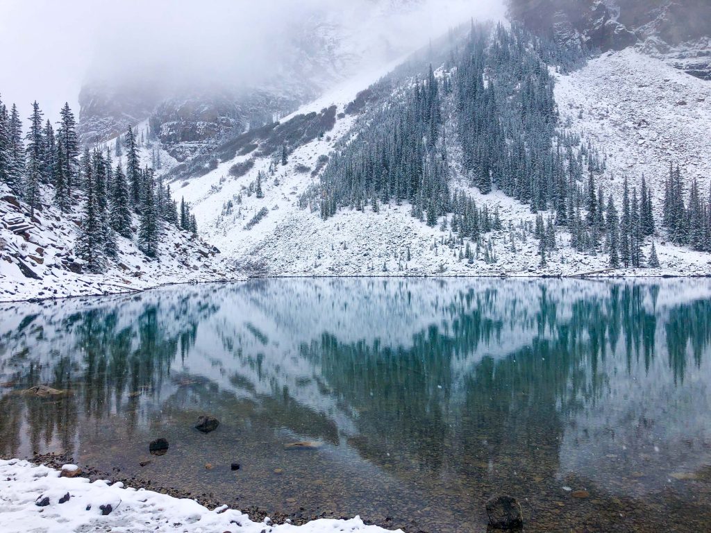 Eenmaal op pad kwam daar toch weer de berenangst. Gewapend met mijn Spotify probeer ik lawaai te maken. Op het begin stuk van de trail kwam ik weinig mensen tegen, iets wat ik bij de latere wandeling ook zou ervaren, maar hoe verder ik kwam, hoe drukker het gelukkig werd. Het zicht op Lake Louise, dat grotendeels van je wandeling aan je zijde blijft, was minimaal. De sneeuwval beperkte mijn zicht.