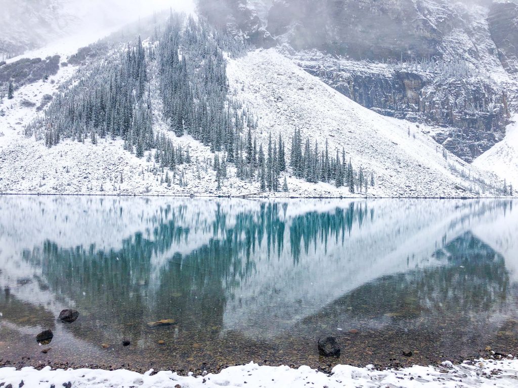 De dag ervan stond ik in alle vroegte op om de Hop on Hop off te pakken en de natuur rondom Banff te verkennen. In een oude gele schoolbus maakten we de eerste stop bij Johnston Canyon. Er werd nog even gewaarschuwd voor beren, dus de eerste meters bleef iedereen redelijk in de buurt. Iets verderop had je Johnston Canyon voor je zelf. Het was ondertussen begonnen met sneeuwen, dus blij met mijn wandelschoenen en winterjas trotseerde ik de verse sneeuw. Na het zien van de twee canyons liep ik weer terug naar de halte voor de Hop on Hop off. Tijd voor Lake Louise. Hier was het inmiddels zo hard gaan sneeuwen, dat het meer helaas niet meer zo blauw was als gehoopt. Ik besloot een wandeling te maken naar Lake Agnes. Al glibberend en met de muziek op de luidste stand wandelde ik die kant op. Onderweg begon het alleen maar meer te sneeuwen waardoor het nog best een uitdaging was om bergop te wandelen en vooral de weg terug naar beneden was af en toe een glibber partij. Na Lake Louise bracht ik een bezoek aan een van de mooiste meren van Banff National Park: Moraine Lake. Ondanks de sneeuw een parel en helderblauw.