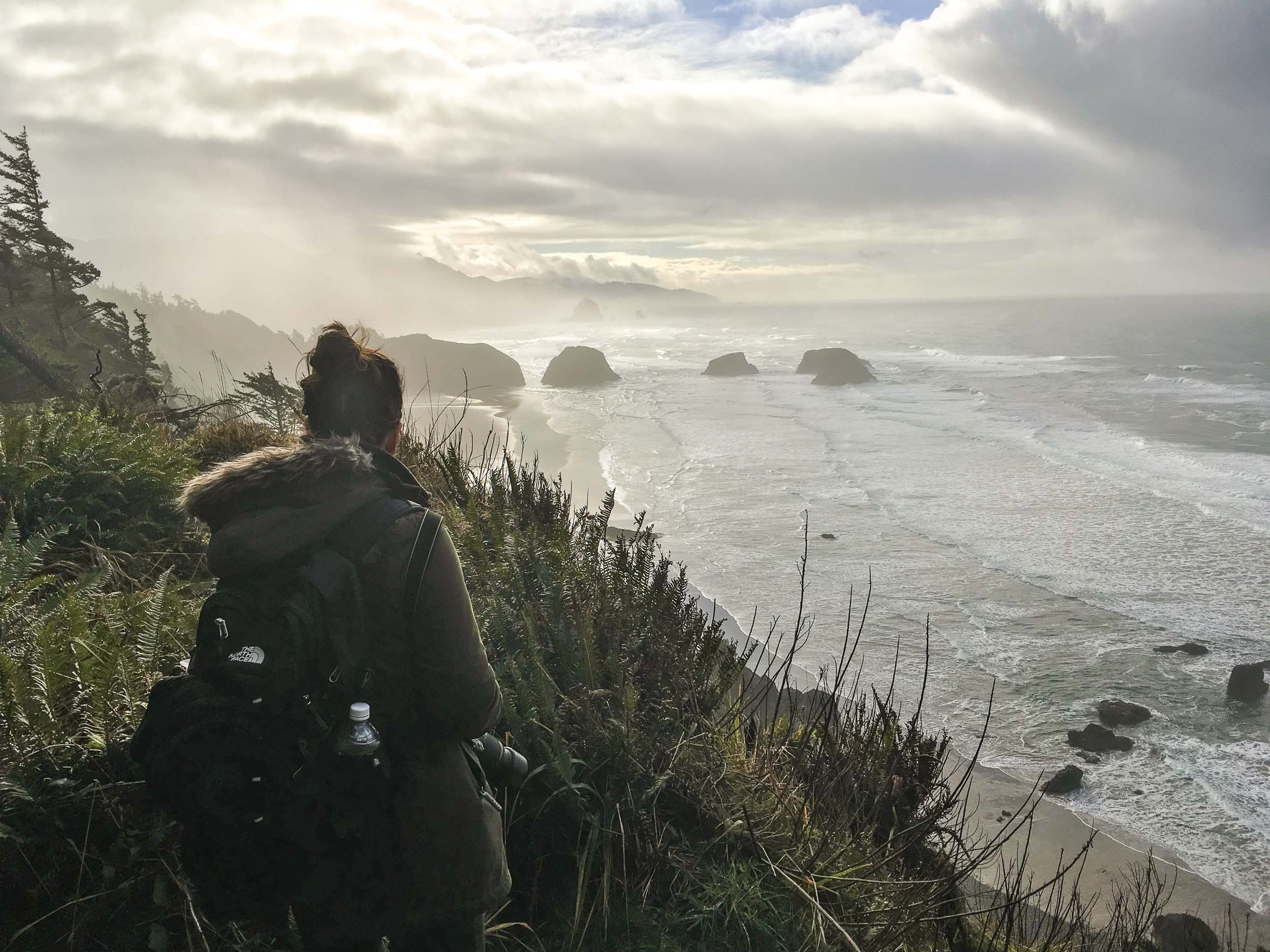 Al snel kom je op een splitsing waarbij je als je links gaat op het strand uit komt. De normale wandelroute gaat rechtsaf. Onderweg is het af en toe flink klimmen en glibberen als het heeft geregend, maar de uitzichten maken dat allemaal goed. Vanachter de boomtoppen zie je af en toe de ruige kust van Oregon verschijnen.