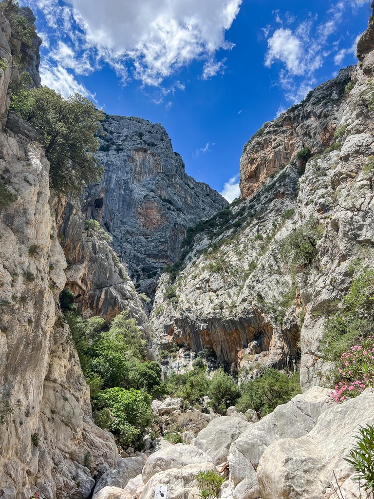 We laten een aantal mensen voor en gaan dan zelf de canyon in. Hier begint het echte klimmen en afdalen op de enorme rotsblokken die er liggen. We moeten zelfs door een piepkleine kloof. Maar eenmaal daaruit zie ik pas echt de contouren van de kloof. Ik voel mij enorm nietig in dit stukje van Sardinië. De diepte is soms meer dan 500 meter. Ik kijk mijn ogen uit en ben blij dat onze gids (we zijn in totaal met vier personen) de tijd neemt om ons de canyon te laten zien.